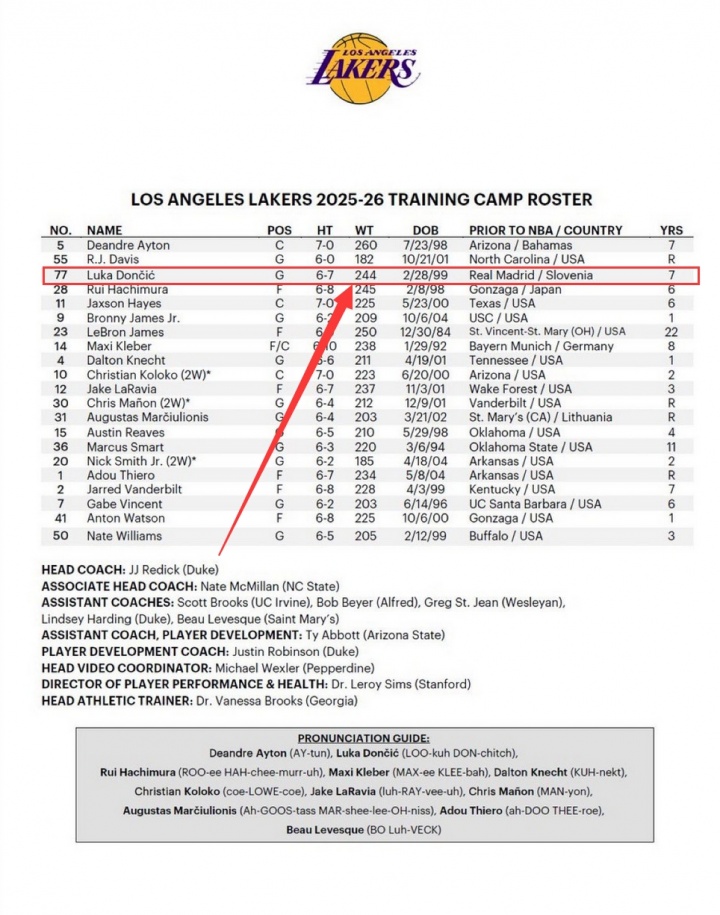 2025-26 Lakers Training Camp Roster