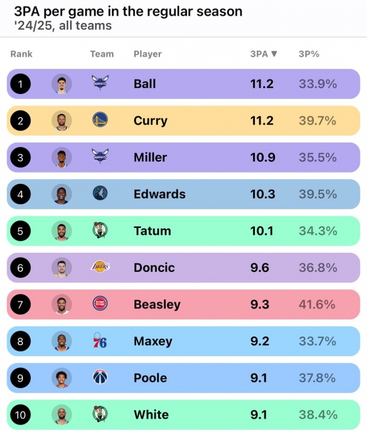Tỷ Số Trực Tuyến 7M5 players averaged 10+ three-pointers per game in a single season, for the first time in the league history