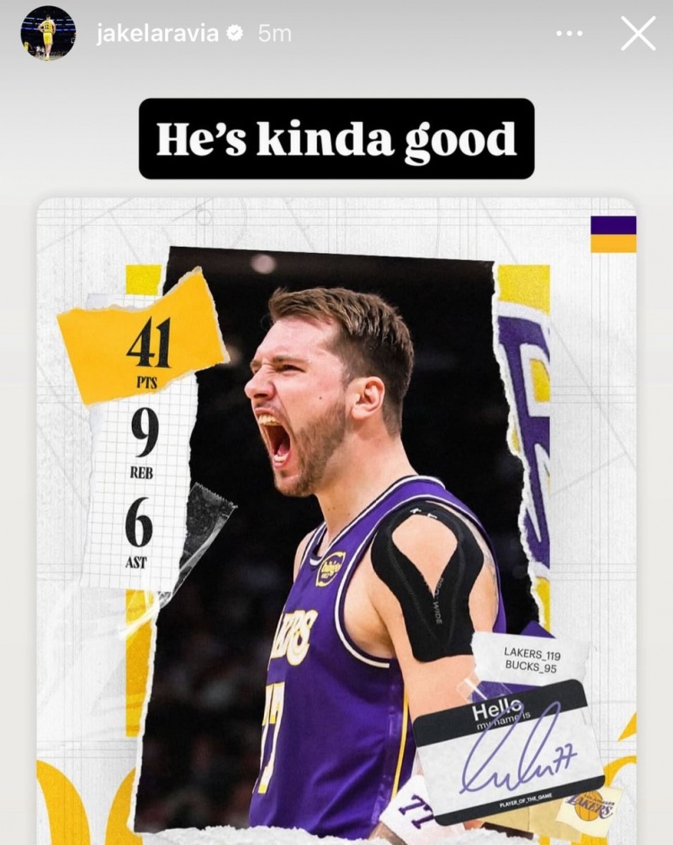 After the game, Lakers player Laravia updated his IG news and forwarded Doncic's poster, and praised: "He is very good."