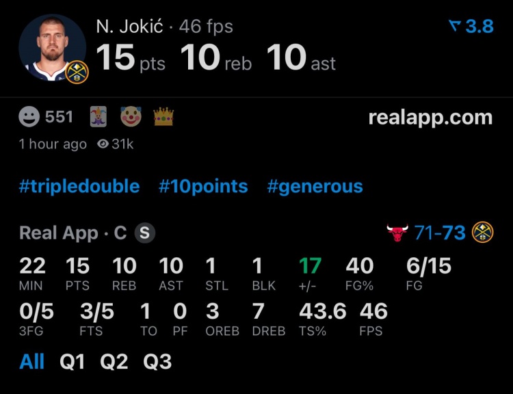 So far in this game, Jokic has played 22 minutes and has scored 15 points, 10 rebounds and 10 assists on 6-of-15 shots.