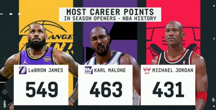 NBA historical opener career scoring list: James leads the way with 549 points, Jordan third with 431 points