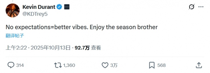 Durant replied: "No expectations = better atmosphere. Enjoy this season, brother."