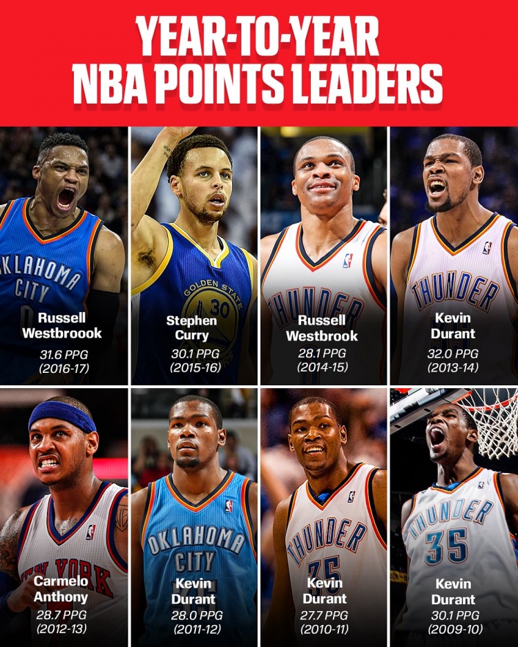 Who will it be this season? Scoring champion in the past 16 years: KD 4 times, Harden 3 times, Westbrook/Curry/Embid 2 times
