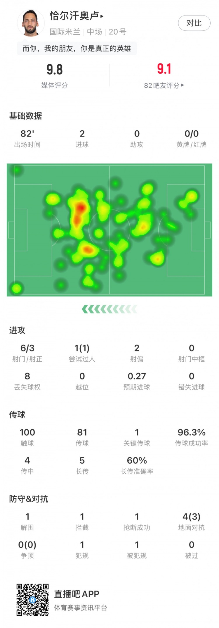 Inter Milan's away match against Juventus is in progress. In this game, Calhanoglu started for Inter Milan and was substituted in the 82nd minute. The player's data for this game are as follows: