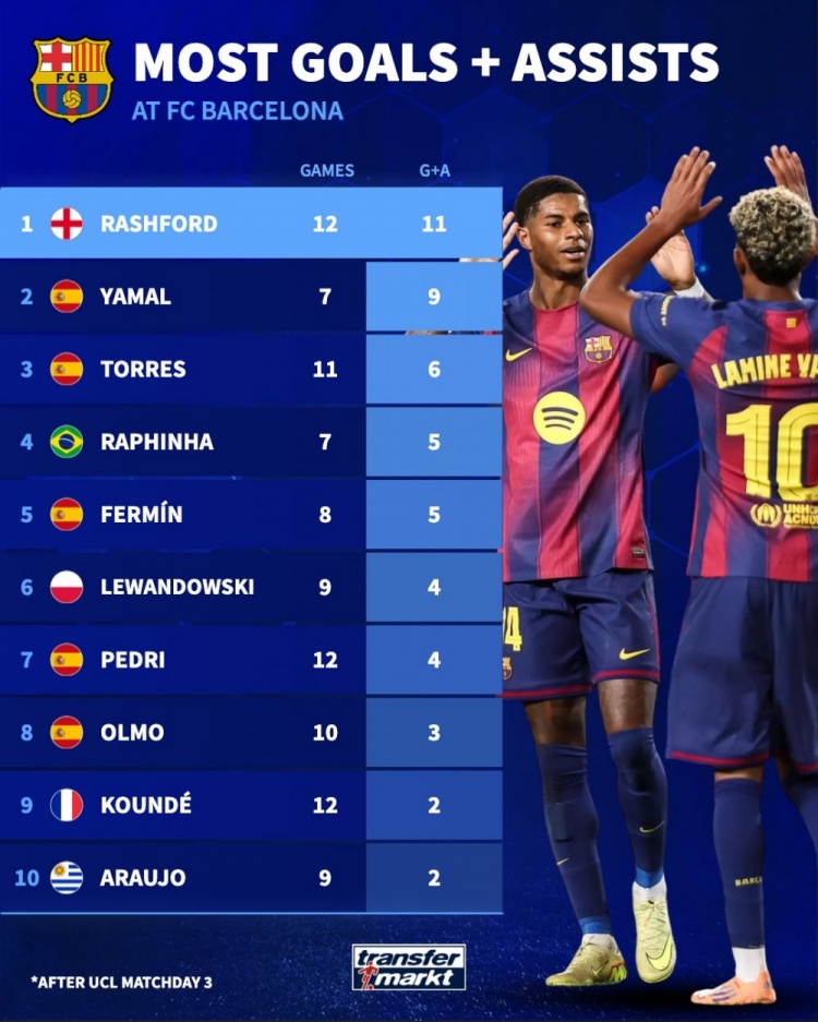 According to statistics from the German transfer market, Rashford has played in 12 games since joining Barcelona, playing 799 minutes, scoring 5 goals, assisting 6 times, and participating in an average of 1.24 goals every 90 minutes.