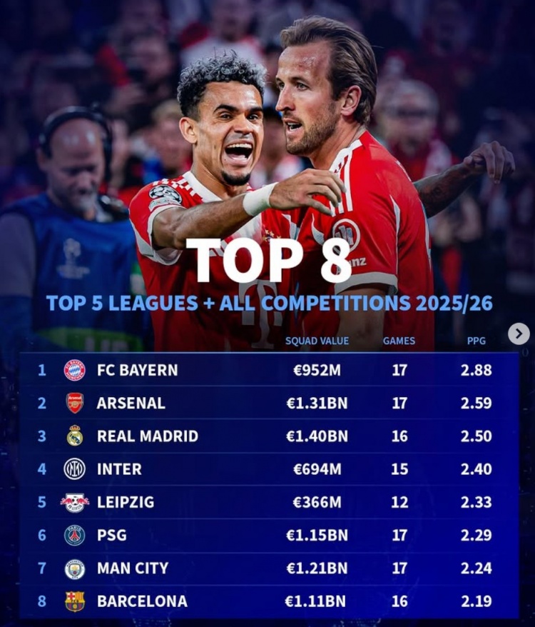 The five major leagues are about to reignite the war. "Transfer Market" has calculated the average points per game of the five major league teams so far this season. Bayern and Arsenal, who are about to face off in the Champions League, rank in the top two.