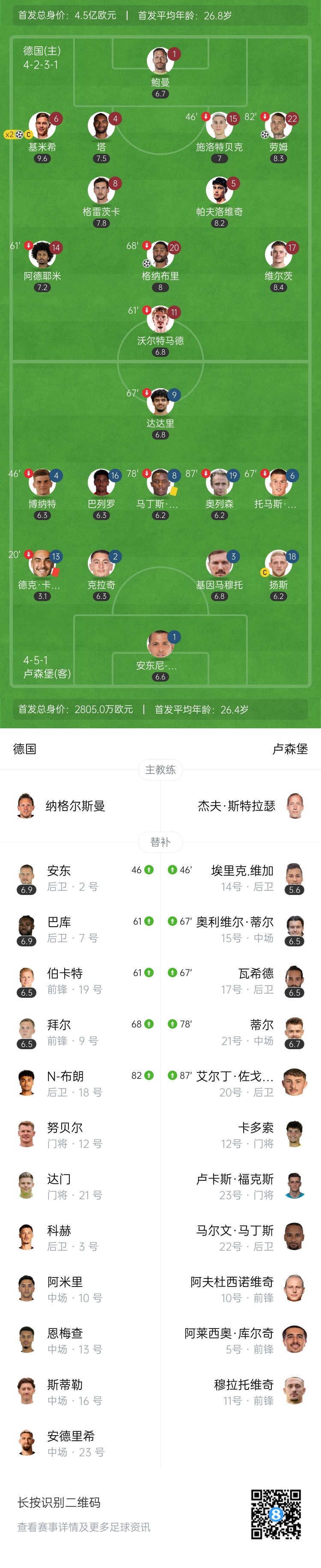 After the final training session at noon on Sunday, the lineup arrangement against Northern Ireland has shown a clear trend. "Bild" reporter Tobias Altschäffl revealed: "We have arrived in Belfast, and my colleagues learned on the spot that the German team plans to use the starting lineup from the previous game, which means Nagelsmann is rare to keep the lineup unchanged."