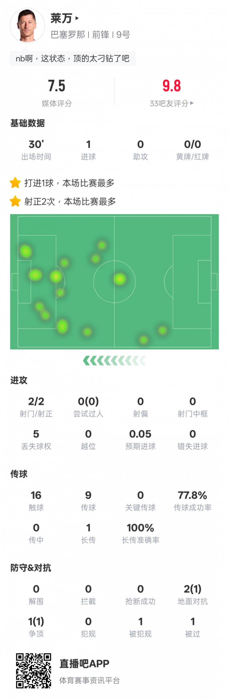 In the 6th round of La Liga in 2025-26, Barcelona defeated Real Oviedo 3-1 away. Lewandowski made a substitute and scored 1 goal with 2 shots and 2 shots, with a score of 7.5.
