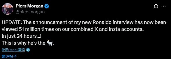 Today, Morgan once again updated social media, saying that the preview released yesterday has received 51 million clicks. Morgan said: My latest interview preview with Cristiano Ronaldo has received a total of 51 million views on our X and Instagram accounts. Achieved in just 24 hours! That's why he is goat.
