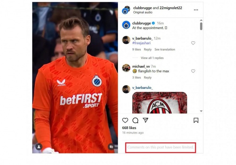 Bruges Club decided to restrict comment permission on its social media pages because a large number of Milan fans left messages and expressed dissatisfaction with the high asking price proposed by Bruges during Jashari's transfer negotiations.