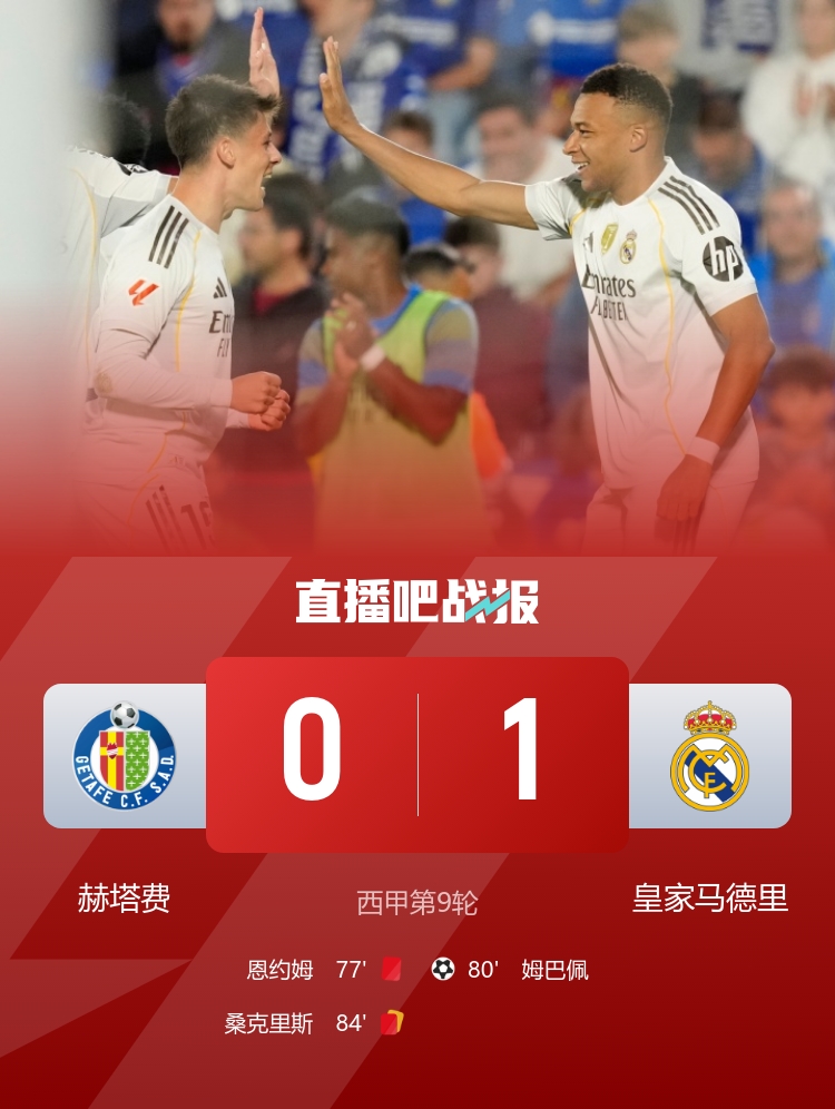 Leading by 2 points! Real Madrid 1-0 nine-man Getafe. Mbappe won. Vinicius came off the bench and made two reds.