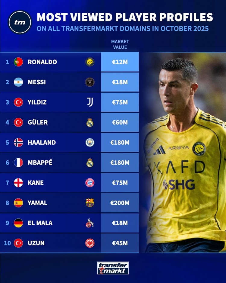 The German transfer market lists the ranking of player page views in October, with Cristiano Ronaldo at the top, followed by Messi and Yildiz.