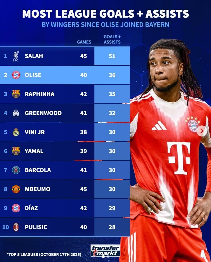 In the latest player value update of Dezhuan, Olise's value increased by 30 million euros to 130 million euros. Dezhuan also took stock of the scoring list of all wingers in the five major leagues since Olise joined Bayern. Olise ranked second after Salah. The details are as follows (goals + assists):