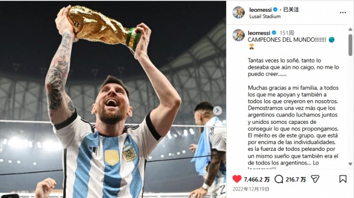 1-Messi’s social media posted a post to celebrate winning the World Cup, 74.662 million
