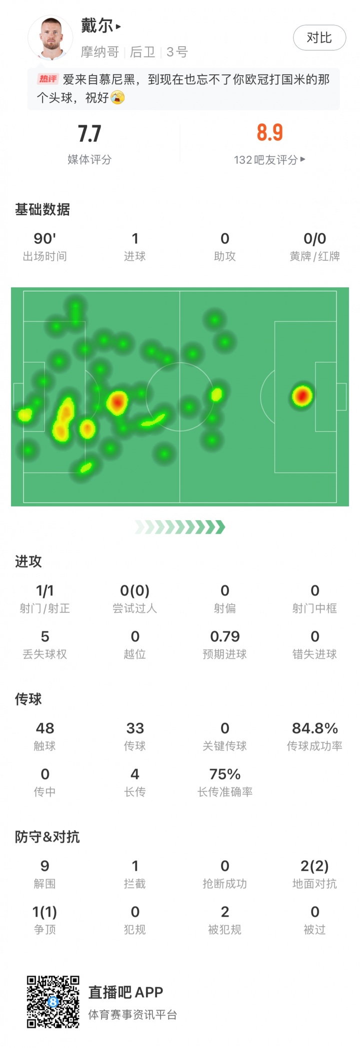In this game, the 31-year-old Dell started the game and scored 7.7 points. In the team, Dell cleared 9 times in this game and intercepted 1, 2 confrontations and 1 top-up. He also made a point and took the penalty and hit it himself.