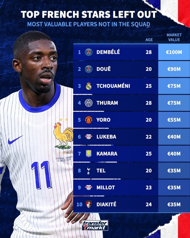 The German transfer market calculated the value of players who were not included in the current French team roster and listed the list. Dembélé topped the list with 100 million euros.