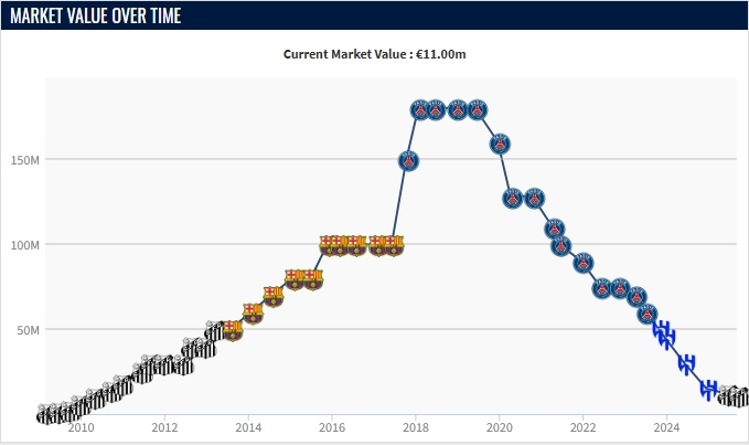 Yesterday, Germany updated the value of the Brazilian League players. The 33-year-old Neymar's net worth fell by 1 million euros again, leaving only 11 million euros.