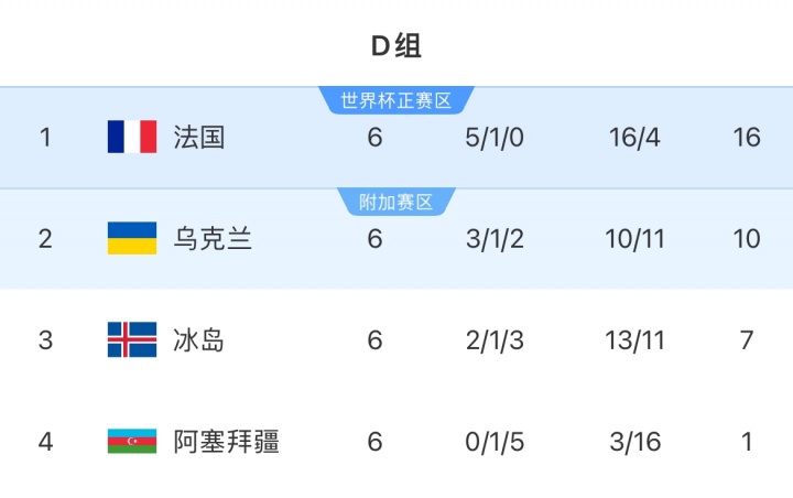 All 6 rounds of Group D in the European preliminaries of the World Cup are over. France has not lost in 6 rounds and has accumulated 16 points. With a 6-point advantage, France has secured the first place in Group D and will go straight to the 2026 World Cup!